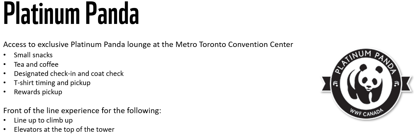 ** The Platinum Panta Experience is for climbers who go above and beyond to raise $1,000 or more. They will check in at the exclusive Platinum Panda lounge where everything from coat check to coffee, snacks and prizing will be taken care of. The Platinum Panda Experience is only applicable at in-person events and may vary between loactions.